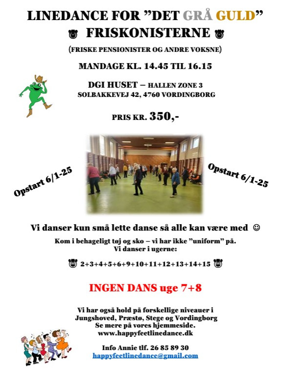 Kom i gang med linedanceDer er ingen krav om specielt tøj eller uniformer, så du kan komme i behageligt tøj og sko. Holdet mødes i DGI Husets Hallen zone 3, hvor der er plads til at bevæge sig frit og nyde dansen.