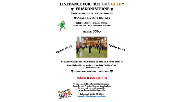 Mandag eftermiddag kl. 14.45 til 16.15 inviterer DGI Vandhuset til linedance for ældre. Holdet "Friskonister" byder på hyggelige og lette danse for absolut begyndere. Her er der fokus på repetition og glæde ved dansen, uden krav om uniform. Medlemskontingentet er 100 kr., og danseafgiften er 250 kr., hvilket samlet giver en entré på 350 kr. for et halvt år.